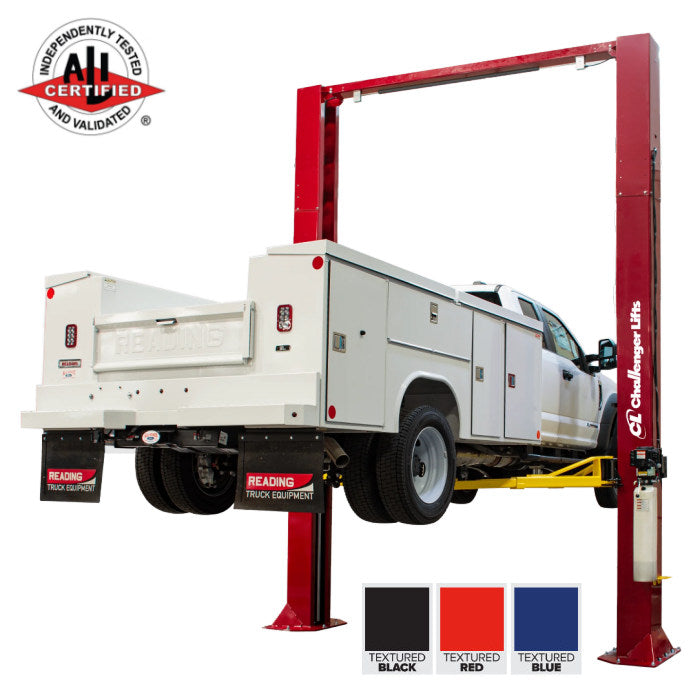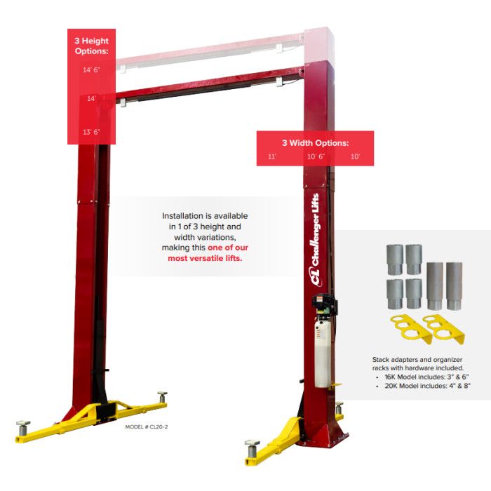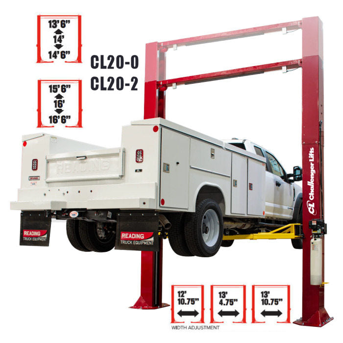 Features ALI Certified 20,000 lbs. Lift Capacity Engineered To Be Widerm, Taller, and Stronger Ready To Tackle the Heaviest Vehicles In Any Fleet 2-Stage Front Arms and 2-Stage Rear Arms Premium Telescoping Screw Pads Adjustable Columns Allow For Flexibility During Installation Adjustable Widths from 12' 10.75" - 13' 4.75" - 13' 10.75" Adjustable Height of 13' 6" - 14' 0" - 14' 6" (Model# CL20-0) Adjustable Height of 15' 6" - 16' 0" - 16' 6" (Model# CL20-2) Single Point Air Actuated Lock Release System Allows Technician to Unlock Both Columns Simultaneously Oversized 5" Steel Pulleys and Heavy-Duty 3/8" Cable Reduces Stress on Equalization System and Increases Cable Life 60" Elongated Lifting Carriage Design Increases Lift Life Adjustable Width and Symmetrical Design Allow Easy Access To Vehicle Interior Padded Overhead Shut Off System Prevents Vehicle Damage Dual Integrated Rubber Door Guards Prevent Door Damage Fully Gusseted Base Plate Design Increases Column Rigidity Premium Textured Powder Coat Finish Provides Long-Lasting Durability Includes (4) 4" and (2) 8" Stack Adapter Extensions with Organizer Rack EV Service Ready Installed at Widest Setting and Equipped with Optional TFPK Footpads Specifications Model Number CL16-0-3S CL16-2-3S CL20-0 CL20-2 Description 16K Standard 16K Extended Height 20K Standard 20K Extended Height Lifting Capacity 16,000 lbs. 16,000 lbs. 20,000 lbs. 20,000 lbs. Lift Configuration Symmetric Symmetric Symmetric Symmetric Arm Configuration 3-Stage Front 3-Stage Rear 3-Stage Front 3-Stage Rear 2-Stage Front 2-Stage Rear 2-Stage Front 2-Stage Rear Maximum Load Per Arm 4,000 lbs. 4,000 lbs. 5,000 lbs. 5,000 lbs. Rise Height (Maximum with Stack Adapters) Min. 75.5" Max. 81.5" Min. 75.5" Max. 81.5" Min. 76.6" Max. 84.6" Min. 76.6" Max. 84.6" Overall Height Options 162", 168", 174" 186", 192", 198" 162", 168", 174" 186", 192", 198" Overall Width Options 166.75", 160.75", 154.75" 166.75", 160.75", 154.75" 166.75", 160.75", 154.75" 166.75", 160.75", 154.75" Drive-Thru Clearance 104.25", 110.25", 116.25" 104.25", 110.25", 116.25" 104.25", 110.25", 116.25" 104.25", 110.25", 116.25" Floor to Overhead Switch 155", 161", 167" 179", 185", 191" 155", 161", 167" 179", 185", 191" Arm Reach Min. 36.625" Max. 75" Min. 36.625" Max. 75" Min. 38.5" Max. 62" Min. 38.5" Max. 62" Screw Pad Height Min. 4.75" Max. 6.5" Min. 4.75" Max. 6.5" Min. 6.2" Max. 7.6" Min. 6.2" Max. 7.6" Between Columns 120", 126", 132" 120", 126", 132" 120", 126", 132" 120", 126", 132" Motor Voltage 3HP 208-230v 60Hz 1Ph 3HP 208-230v 60Hz 1Ph 3HP 208-230v 60Hz 1Ph 3HP 208-230v 60Hz 1Ph Air Supply Required 90-120 psi 90-120 psi 90-120 psi 90-120 psi Rise Time 62 s 62 s 62 s 62 s Min. Ceiling Height Required 13'8", 14'2", 14'8" 15'8", 16'2", 16'8" 13'8", 14'2", 14'8" 15'8", 16'2", 16'8" Colors Available Textured Red, Blue, Black Textured Red, Blue, Black Textured Red, Blue, Black Textured Red, Blue, Black Service Bay Specifications Bay Height: 13' 6" Minimum Bay Width: 16' Recommended Bay Depth: 28' Recommended Power: 208v-230v, 1Ph, 30 Amp Breaker Air: 90-120 PSI Minimum Concrete: 4" Thick, Reinforced, Free From Cracks/Seams, 3500+ PSI and Cured 28+ Days * Optional 3-phase electrical also available, please specify at time of order. Warranty: (5) Years on Structure, (2) Years on Functional Parts, (1) Year Labor Challenger Lifts Warranty Statement Challenger Lifts, Inc. (CLI) lifts are guaranteed to the original owner. CLI shall repair or replace, at CLI option, for the full warranty period those parts that prove upon inspection to be defective and pay for all reasonable costs of transportation and/or labor for replacement of said parts for the warranty period stated below. This warranty shall not apply unless the product is installed, used and maintained according to CLI's specifications set forth in CLI's installation, operation, and maintenance instructions. Use of any unapproved parts or accessories will void your warranty. This limited warranty extends only to the original purchaser and in not transferable. This warranty is valid only if the product has been registered with Challenger lifts. This warranty does not cover normal maintenance or adjustments, damage or malfunction caused by improper handling, installation, abuse, misuse, negligence, carelessness of operation, or normal wear and tear. In addition, this warranty does not cover equipment when repairs have been attempted or made by anyone other than a CLI authorized service representative. This warranty is exclusive and is in lieu of all other warranties expressed or implied including any implied warranty of fitness for a particular purpose, which implied warranties are expressly excluded. No employee, agent, representative, dealer or other person or entity is authorized to give any warranties of any nature on behalf of CLI. The remedies described are exclusive and in no event shall CLI, Inc. be liable for special, consequential or incidental damages for the breach of or delay in performance of the warranty. This warranty shall be governed by the Commonwealth of Kentucky, and shall be subject to the exclusive jurisdiction of the Court in the Commonwealth of Kentucky in the County of Jefferson. Functional parts are considered the power units, cylinders, sheaves, sheave pins, hoses, hydraulic & pneumatic fittings, cables, adapters, latched, valves, and controls. Structural parts are considered the carriage, columns, column extensions, overhead beams, arms, cross beams, runways, wheel stops, ramps, bolsters., sync rails, and plungers. Note: Warranty registration must be completed online at challengerlifts.com/register-your-lift or warranty period will begin from invoice date of lift purchase.
