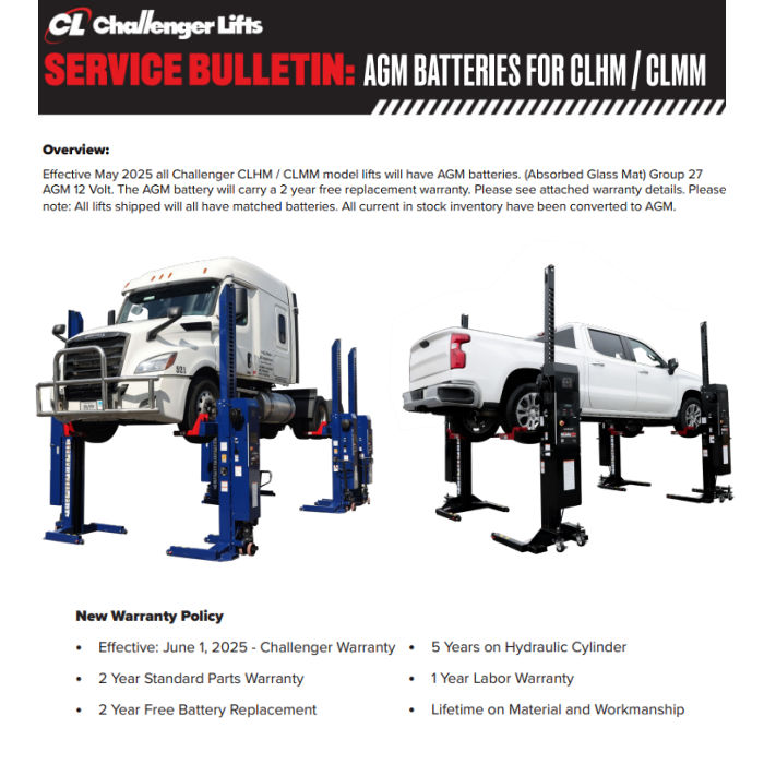 Effective May 2025 all Challenger CLHM / CLMM model lifts will have AGM batteries. (Absorbed Glass Mat) Group 27 AGM 12 Volt. The AGM battery will carry a (2) Year Free Replacement Warranty. Please note: All lifts shipped will all have matched batteries. All current in stock inventory have been converted to AGM. AGM batteries are less prone to desulfation and degradation helping to alleviate the number one cause of issues on Mobile Columns - forgetting to plug them in. It can't solve forgetfulness, but it will help alleviate some of the side effects.