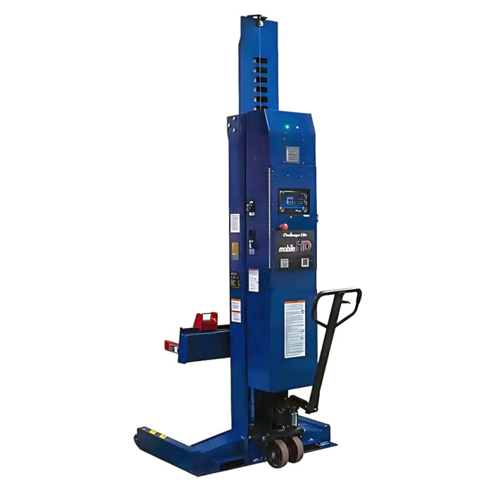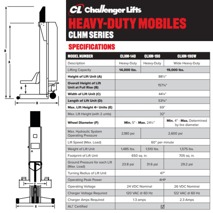 The Challenger Lifts CLHM-190 Heavy-Duty Mobile Column Lift System is robust, yet easily maneuverable and can be operated on almost any solid surface, indoors or out. The CLHM-190 has a heavy-duty lifting capacity of 19,000 lbs. per column. Mobile column lifts provide the flexibility and convenience to lift any rubber-tired vehicle, from small passenger cars to large 2-, 3- or 4-axle vehicles up to 152,000 pounds with 8 columns. These heavy-duty mobile column lifts are also capable of lifting vehicles of any axle length or wheelbase. With the addition of optional adapters, these easily configurable columns are capable of many additional lifts including forklifts, vehicles with plows attached, wheels-free lifting, vehicle end lifting, and even cab off lifting. Challenger Lifts CLHM-190 Heavy-Duty Mobile Column Lifts are ALI and ETL Certified.