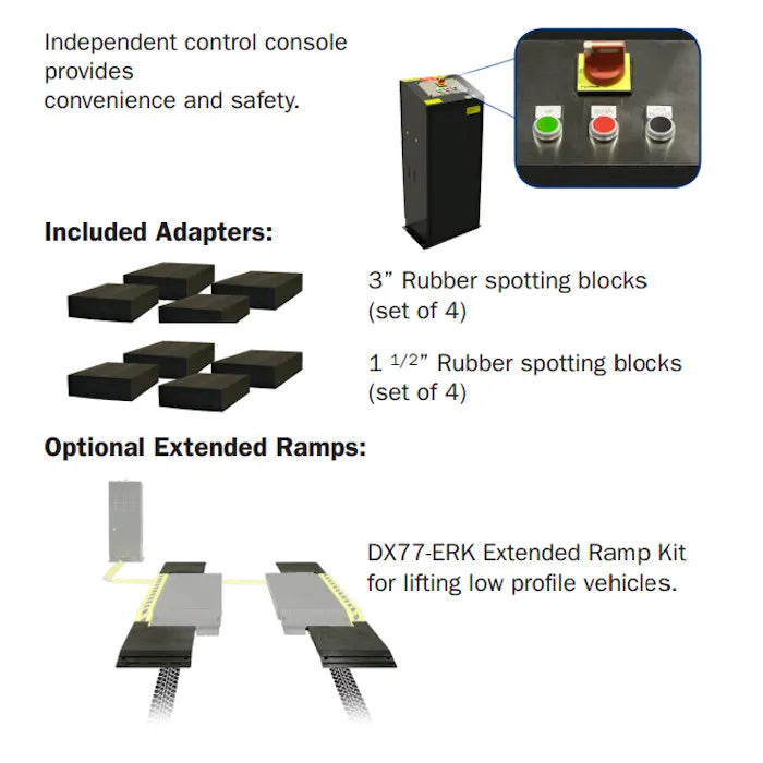 The Challenger Lifts DX77 full-rise low profile 7,700 lbs. capacity double scissor lift was engineered with efficiency and productivity in mind. The DX77 can easily lift all makes and models (within rated capacity) with a synchronized hydraulic system. The DX77 also offers free access all around the lifted vehicle and between platforms, with a crossmember free design providing an uncluttered and hazard-free work area. The DX77 is availble flush mount, surface mount, and surface mount with extended ramps. The DX77 is ALI and ETL Certified.