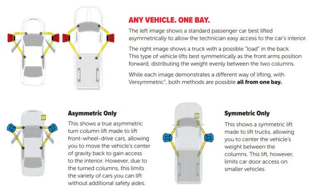 - Versymmetric® 3-stage-front arms safely lift both symmetrically and asymmetrically within the same service bay maximizing service capabilities and revenue potential
