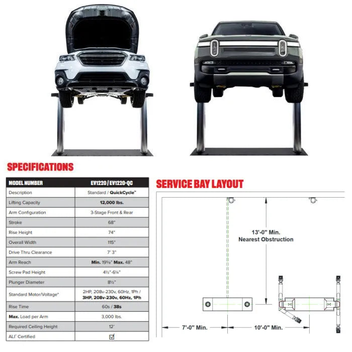 The Challenger Lifts EV1220 electric hydraulic cassette-style 12,000 lbs. capacity inground lift brings flexibility to any professional service facility. With a smaller footprint, your shop can maximize service bays. Able to handle full-sized vehicles to heavy-duty trucks and SUVs, the wide range of capabilities provides an ideal solution for fleet maintenance. The EV1220 comes standard with true 3-stage front and rear arms, which have the ability to lift a larger range of heavier vehicles. Models featuring QuickCycle can rise in just 38 seconds. Expand your service potential with our most versatile, easy-to-operate inground lift. The EV1220 is ALI and ETL CertifiedAs of 04/21/25, the EV1220 features a new Bucher Power Unit which will only require a 20 Amp Breaker. Scroll down for more details.