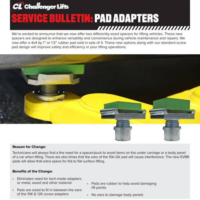 Technicians will always find a the need for a spacer/puck to avoid items on the under carriage or a body panel of a car when lifting. There are also times that the ears of the 10k-12k pad will cause interference. The new EVBR pads will allow that extra space for flat to flat surface lifting.