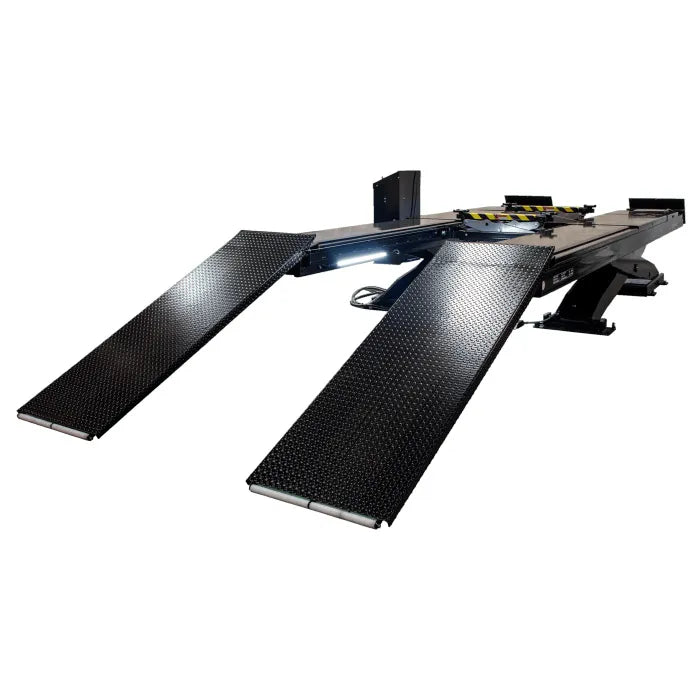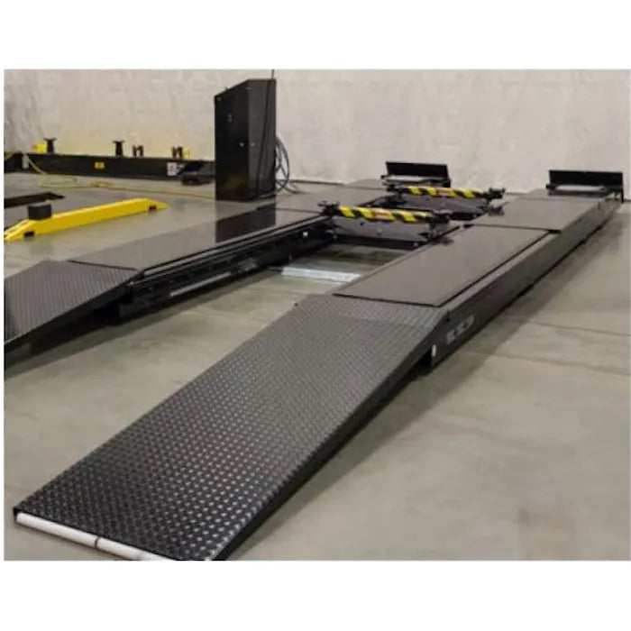 The Challenger Lifts SX14 Series Scissor Alignment Lifts are easy to operate, provide increased accessibility to alignment adjustment areas and are easy to load. Space saving design allows more scissor lifts to fit into the same operating space as 4-post lifts. Adjustable turnplate pockets allow for a wider range of wheelbase alignments. The SX14 features include LED lighting, extra wide runways, single point air actuated lock release, single locking point rear slip plates, photo cell to ensure runway synchronization, approach ramp rollers, and drive-on and off runway design. The SX14 is available flush mount, surface mount, and surface mount with extended ramps for low clearance vehicles. The SX14 is ALI and ETL Certified. Alignment Package Includes: (2) 7,000 lbs. Capacity Rolling Jacks, (2) Stainless Steel Turntables, (2) Rear Slip Plates, and Dual Jack Airline Kit.