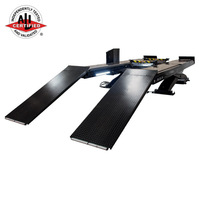 The Challenger Lifts SX14 Series Scissor Alignment Lifts are easy to operate, provide increased accessibility to alignment adjustment areas and are easy to load. Space saving design allows more scissor lifts to fit into the same operating space as 4-post lifts. Adjustable turnplate pockets allow for a wider range of wheelbase alignments. The SX14 features include LED lighting, extra wide runways, single point air actuated lock release, single locking point rear slip plates, photo cell to ensure runway synchronization, approach ramp rollers, and drive-on and off runway design. The SX14 is available flush mount, surface mount, and surface mount with extended ramps for low clearance vehicles. The SX14 is ALI and ETL Certified. Alignment Package Includes: (2) 7,000 lbs. Capacity Rolling Jacks, (2) Stainless Steel Turntables, (2) Rear Slip Plates, and Dual Jack Airline Kit.