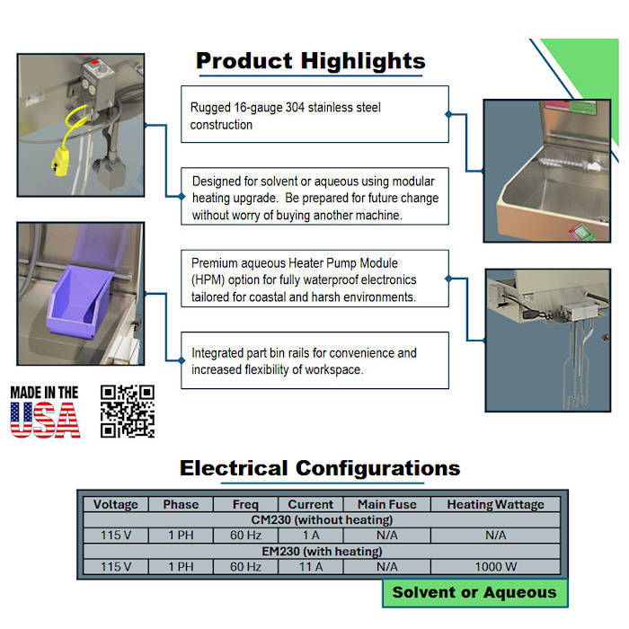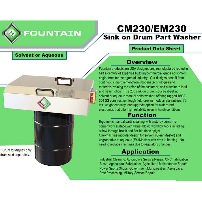 Fountain products are USA designed and manufactured rooted in half a century of expertise building commercial grade equipment engineered for the rigors of industry. Our designs benefit from continuous improvement from modern technologies and materials, valuing the voice of the customer, and a desire to lead and never follow. The 230 sink on drum is our best-selling solvent or aqueous manual parts washer, offering rugged 16GA 304 SS construction, tough field-proven modular assemblies, 75 lbs. weight capacity, and upgrade option for waterproof electronics that offer high reliability even in harsh conditions.