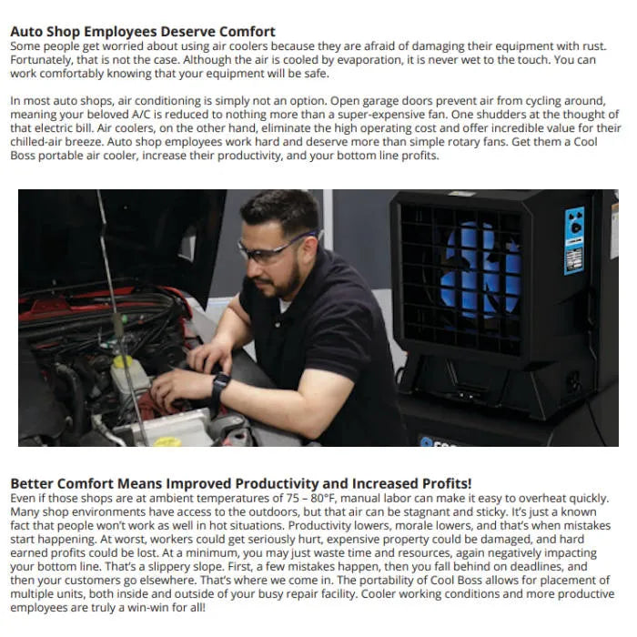 Auto Repair Shops Just Got CoolerCool Boss is another quality line under the BendPak umbrella of products and shop equipment. That means our portable air coolers are made by the world leaders in automotive shop equipment. We understand repair shop equipment needs, and we believe adding Cool Boss will be another valuable addition. Mechanics often work long hours, bending, hunching, and straining to get work done efficiently and safely. Let's face it, repair work is labor intensive, so cooling your service bays is an added "perk" for all your busy technicians!