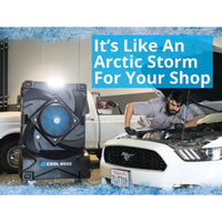 The Cool Boss CB-28HV is engineered for large-scale performance, delivering high-velocity airflow that covers over 6,000 square feet of cooling area. Whether you're working in an aircraft hangar, warehouse, or oversized service bay, this powerhouse cooler creates a wide, refreshing zone that transforms even the hottest environments into productive, breathable spaces. With its 28-inch axial fan and high-efficiency motor, the CB-28HV pushes serious air volume across long distances. That means more coverage, fewer hot spots, and no need for multiple smaller units cluttering your floor. It's cooling power on an industrial scale - streamlined into one heavy-duty machine. If you need to move air fast and cover a lot of ground, the CB-28HV is your answer. Designed for extreme conditions and expansive spaces, it's the cooler you count on when square footage is no longer a small problem. The CoolBlast series is loaded with features to make your work as convenient as possible. With the LED floodlights installed on your Cool Boss you'll be putting out 4,000 lumens of bright light so you can turn night into day. The CoolBlast Series also come standard with a negative air ionizer which then helps clean the air by making airborne particles like allergens and bacteria to be easily stuck to floor and walls. Every CoolBlast model comes sporting a Bluetooth audio player so you can blast your music while you're blasting cold, refreshing air.