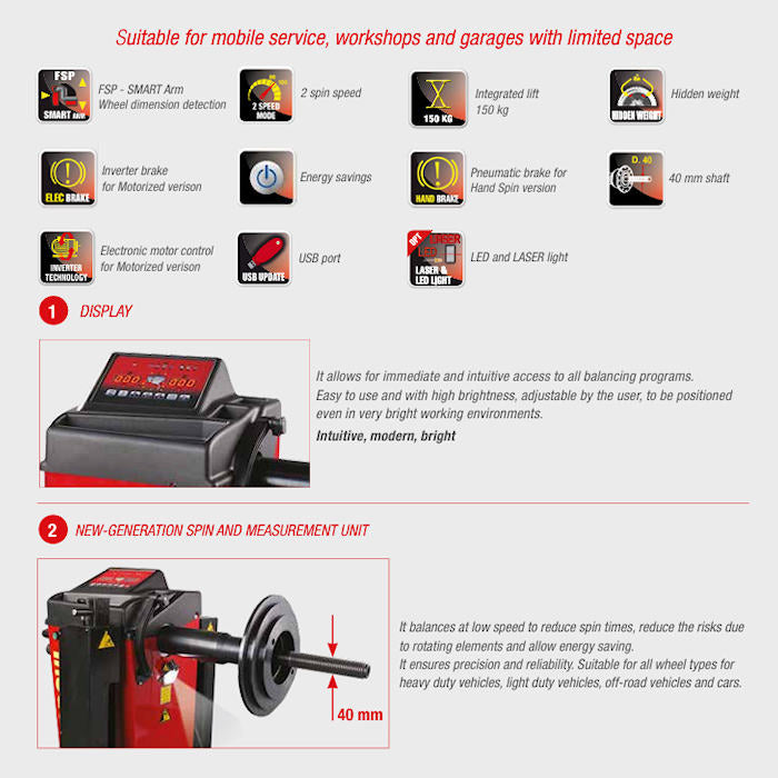 Balances at low speed to reduce spin times, reduce the risks due to rotating elements and allow energy saving. It ensures precision and reliability. Suitable for all wheel types for heavy duty vehicles, light duty vehicles, off-road vehicles and cars.