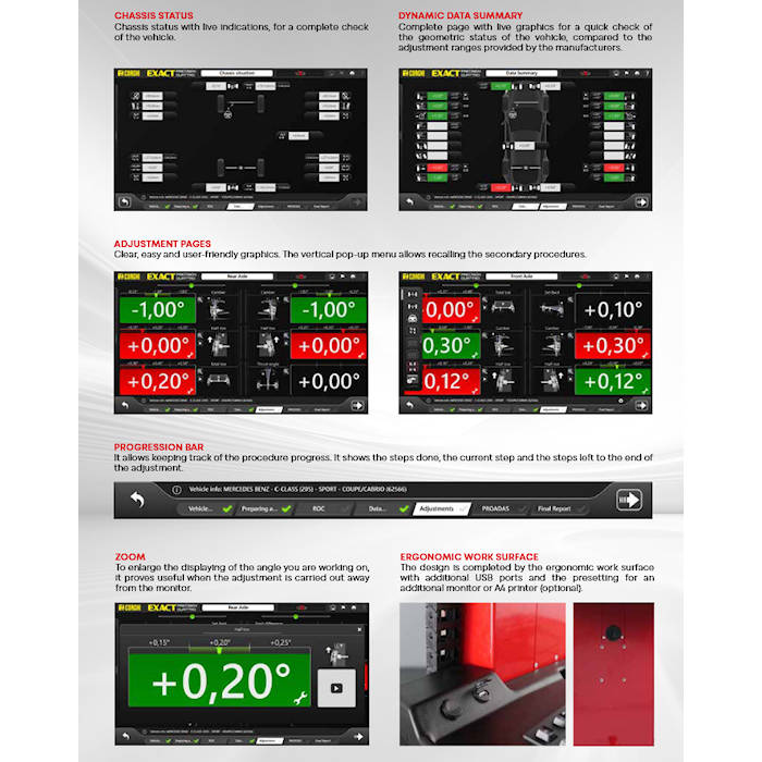 The Corghi Exact Precision Quattro 3D Wheel Aligner is the new wheel aligner with passive targets and 4 high-resolution digital cameras, to ensure measurement maximum precision and accuracy. The automation of wheel alignment operations and the extreme reliability of components enhance its productivity. Premium PC with the latest Windows Professional operating system, new Exact Alignment TOP software including a complete database with multi-brand technical specifications are part of the rich standard equipment.