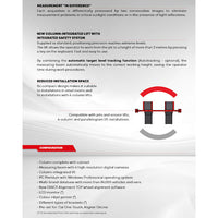 By combining the automatic target level tracking function (Autotracking - optional), the measuring beam automatically moves to the correct working height, saving the operator time during work procedures. Its compact design makes it suitable to installations in small rooms and to installations with 4-column lifts. Compatible with pits and scissor lifts, 4-column and parallelogram lift installations.