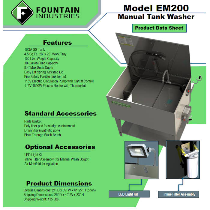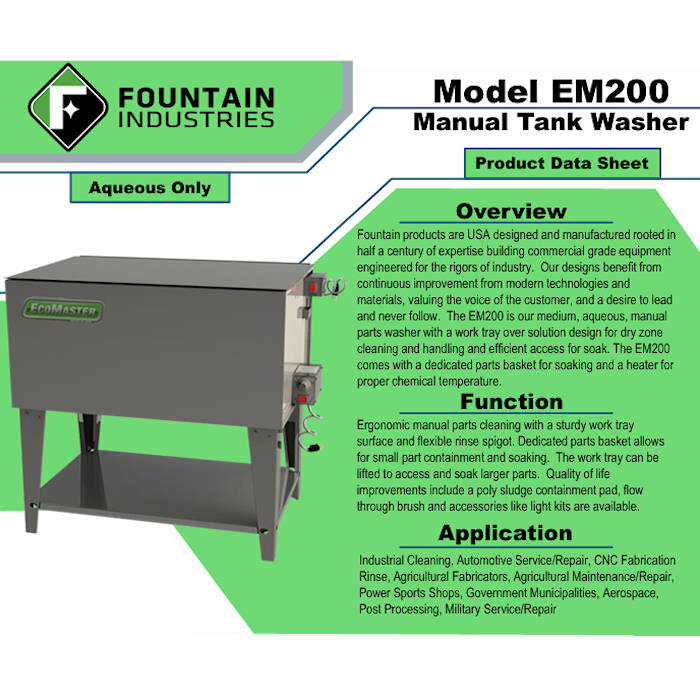 Fountain products are USA designed and manufactured rooted in half a century of expertise building commercial grade equipment engineered for the rigors of industry. Our designs benefit from continuous improvement from modern technologies and materials, valuing the voice of the customer, and a desire to lead and never follow. The EM200 is our medium, aqueous, manual parts washer with a work tray over solution design for dry zone cleaning and handling and efficient access for soak. The EM200 comes with a dedicated parts basket for soaking and a heater for proper chemical temperature.