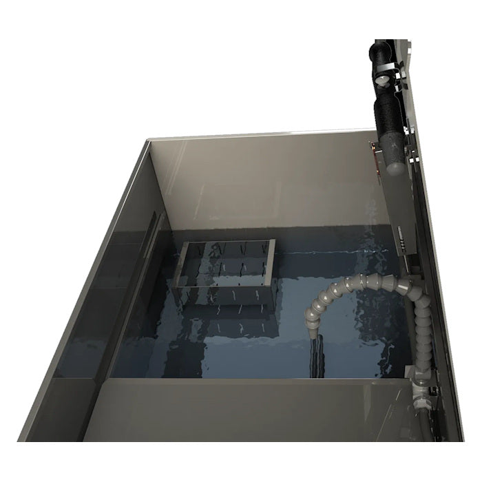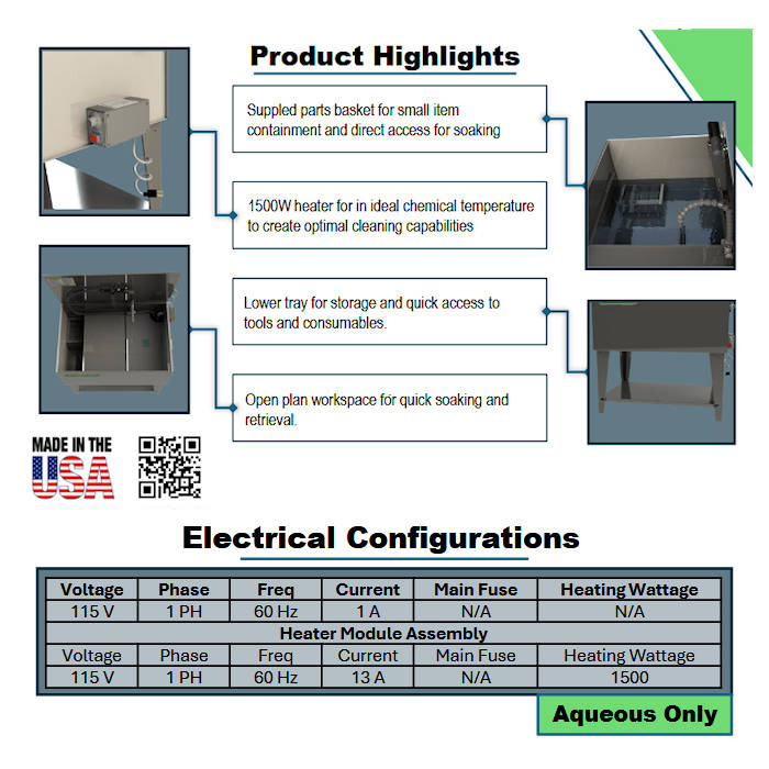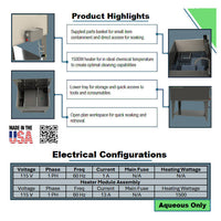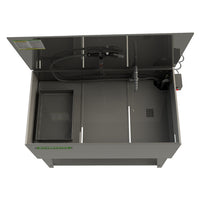 Ergonomic manual parts cleaning with a sturdy work tray surface and flexible rinse spigot. Dedicated parts basket allows for small part containment and soaking. The work tray can be lifted to access and soak larger parts. Quality of life improvements include a poly sludge containment pad and accessories like flow-through brush and light kits are available.