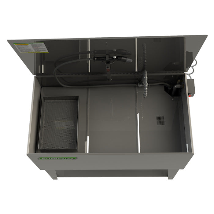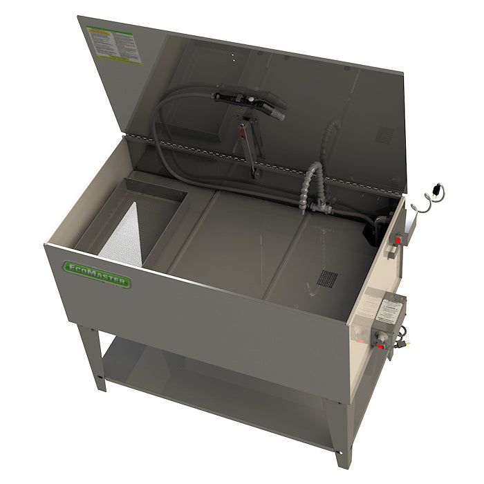 The EcoMaster EM440 Stainless Aqueous Parts Washer is our large, aqueous, manual parts washer with a work trays over solution design for dry zone cleaning and handling and efficient access for soak. Work area is specifically maximized for in the EM440 to handle bigger parts and large batches with a heater for proper chemical temperature.