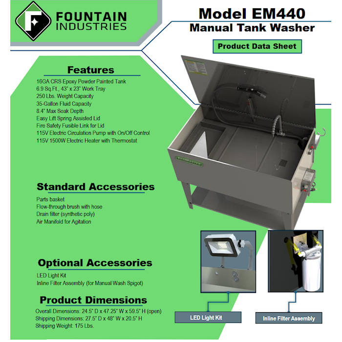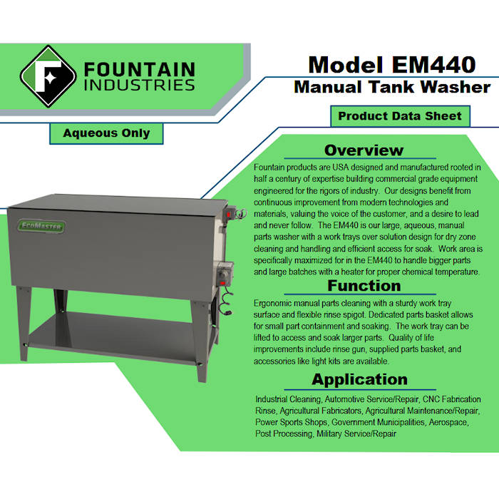 Fountain products are USA designed and manufactured rooted in half a century of expertise building commercial grade equipment engineered for the rigors of industry. Our designs benefit from continuous improvement from modern technologies and materials, valuing the voice of the customer, and a desire to lead and never follow. The EM440 is our large, aqueous, manual parts washer with a work trays over solution design for dry zone cleaning and handling and efficient access for soak. Work area is specifically maximized for in the EM440 to handle bigger parts and large batches with a heater for proper chemical temperature.
