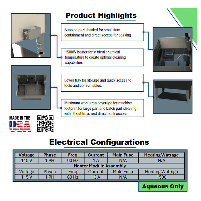 - Maximum work area coverage for machine footprint for large part and batch part cleaning with lift out trays and direct soak access