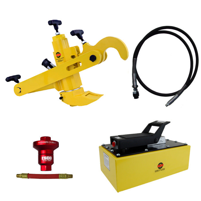 The ESCO #10107 Euro Style Bead Breaker Tool is a lightweight aluminum bead breaker that reduces weight of the tool by approx. 20+%. Works on all single piece, 2-piece, and 3-piece tires & rims. Provides 13.8 tons of bead breaking force. The ESCO #10592 5 Quart Turbo II Hydraulic Air Pump features a rugged metal reservoir with enough oil capacity to operate lifting jacks, cylinders, and then switch to bead breaking tools. The ESCO #10604 8' Hose Assembly with Hose Coupler won't kink, is reinforced with 2 layers of braided steel, and can withstand extreme cold temperatures. The ESCO #10601K Air Pressure Reducer with 6" Whip-Hose is designed to regulate the air pressure that is received by the hydraulic pump, which is then used to power all ESCO Hydraulic Tools.