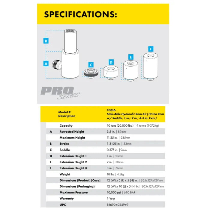 With multiple, easy to snap in, extensions this 10 ton ram is the most versatile unit on the market. Applicable for any lifting, pushing, or pulling application in the market, with a minimum height of 3.5" and maximum (with all extensions and saddle) of 11.25".