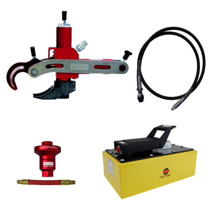 The ESCO #10242 Euro Style Long Aluminum Bead Breaker Kit is for serious tire professionals. Lightweight and durable aluminum design will last for years. Works on all three-piece wheel assemblies with 5 tons of bead-breaking force and 4.75" (120mm) of stroke. Detaches inside and outside truck and tractor tire beads from rims. Works on Earthmover Style EM Tires 25" to 27". Great for use on Caterpillar 952G, 924G, Volvo L120 rim configurations. The ESCO #10592 5 Quart Turbo II Hydraulic Air Pump features a rugged metal reservoir with enough oil capacity to operate lifting jacks, cylinders, and then switch to bead breaking tools. The ESCO #10604 8' Hose Assembly with Hose Coupler won't kink, is reinforced with 2 layers of braided steel, and can withstand extreme cold temperatures. The ESCO #10601K Air Pressure Reducer with 6" Whip-Hose is designed to regulate the air pressure that is received by the hydraulic pump, which is then used to power all ESCO Hydraulic Tools.