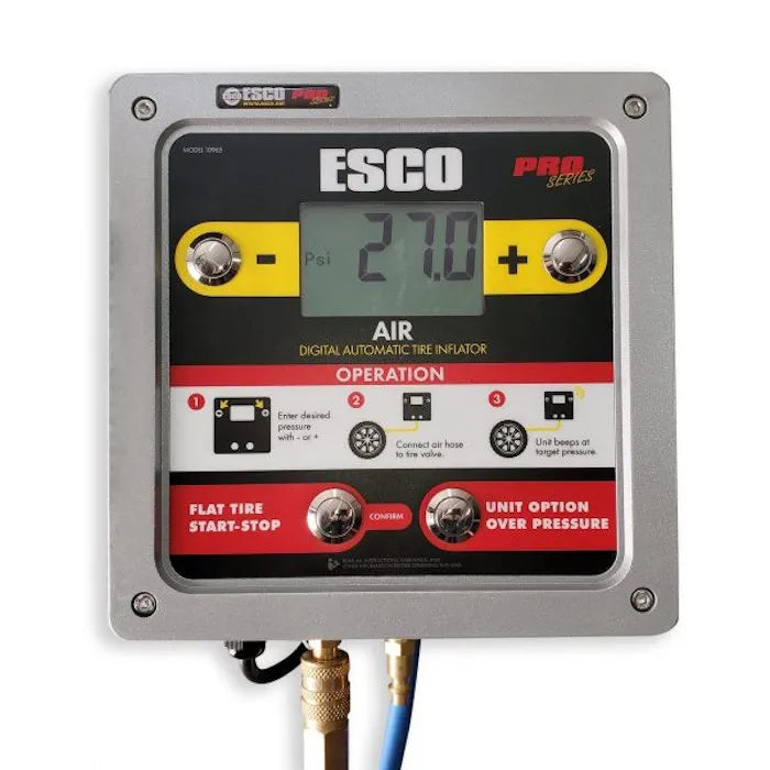 The ESCO 10965-K Digital Wall Mounted Tire Inflator with Tire Inflation 4-Way Manifold System is a wall mountable inflation system cased in a robust die cast aluminum housed digital automatic inflator is simple to use with plug and play design, all the customer needs to do is preset the required pressure, place the chuck on the tire valve and the built-in auto start inflates/deflates the tire to the specified pressure. This unit accurately inflates tires with up to 164 ft. of air hose. With an accuracy rating of +/- 0.3 psi and a 1-year warranty, this professional inflation unit is perfect for any application. This kit includes 4-Hose Manifold System for inflating 4-tires at once.