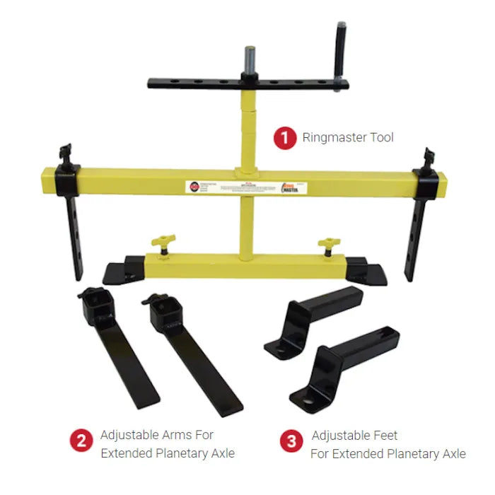 The ESCO 70162K Ringmaster Kit is a lightweight and easy to use o-ring and lock ring installer. The Ringmaster pushes and holds the rim flange and tire back for easy o-ring/lock ring installation. It allows one man operation, fits in a tire truck tool box, and eliminates the use of a boom crane, cumbersome tire tools, and the danger of pushing equipment off jack with a crane. The Ringmaster works on all 3-piece and 5-piece rims and wheels up to 39" diameter.