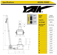 The ESCO 92005 Yak 22-44 Ton Portable Air Hydraulic Jack is designed to be portable, easy to use, and compact in design. With a removable handle and storage for the extensions on the handle, this jack is incredibly portable. Jack lifting capacity to handle up to 44 Tons. With a minimum height of 6.69" and a maximum height of 13.42" (with out extensions), this jack is perfect for any service bay or truck.