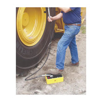The ESCO #10105 Giant Tire Bead Breaker Tool features a smaller more compact design that fits on the backside of most wheels and is for use on 5-piece rims 25" and 29" earthmover tire/wheels with pry bar/bead loosening pocket. The ESCO #10518 is specifically designed for automotive, light truck, and heavy-duty applications. The ESCO #10604 8' Hose Assembly with Hose Coupler won't kink, is reinforced with 2 layers of braided steel, and can withstand extreme cold temperatures. The ESCO #10601K Air Pressure Reducer with 6" Whip-Hose is designed to regulate the air pressure that is received by the hydraulic pump, which is then used to power all ESCO Hydraulic Tools.
