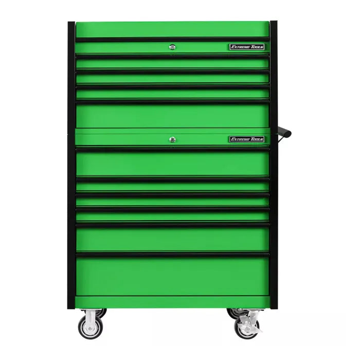 Extreme Tools DX Series DX4110CR 41" 4 Top Chest and 6 Drawer Roller Cabinet has features that make it a great value! The cabinet is a big 25 inches deep! There is a ton of storage for tools of all shapes and sizes in the full-width drawers - three are double deep and one is triple deep! Plus, there is plenty of room for larger, bulkier items under the lid in the huge open till area. Order your Extreme Tools Top Chest and Cabinet Combo today, and benefit from the combination of DX4104CH 41", 4 Drawer Top Chest with the DX4106RC 6 Drawer Roller Cabinet. The resulting 41 Inch Top Chest and Roller Cabinet Combo will help you organize your tools in the most efficient way, allowing you to focus on your tasks without distractions caused by missing or misplaced tools. Move It Easily And Secure It With Peace Of Mind