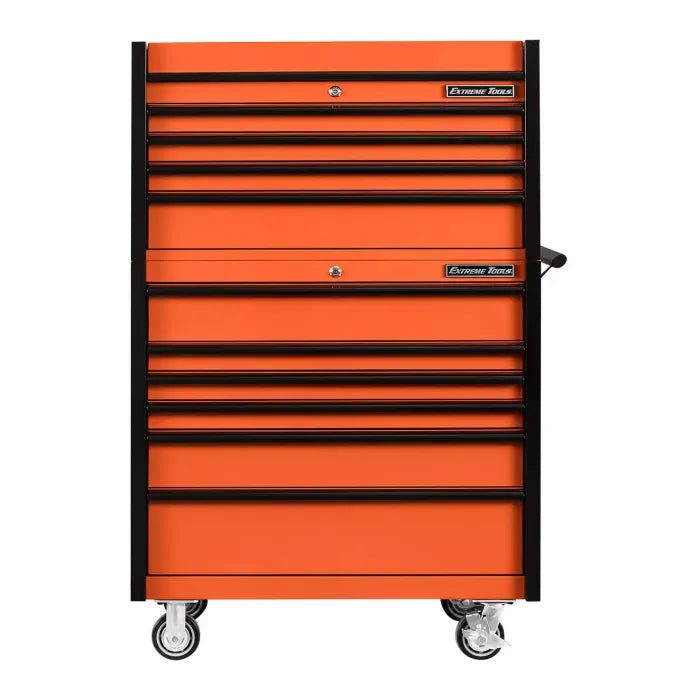 Extreme Tools DX Series DX4110CR 41" 4 Top Chest and 6 Drawer Roller Cabinet has features that make it a great value! The cabinet is a big 25 inches deep! There is a ton of storage for tools of all shapes and sizes in the full-width drawers - three are double deep and one is triple deep! Plus, there is plenty of room for larger, bulkier items under the lid in the huge open till area. Order your Extreme Tools Top Chest and Cabinet Combo today, and benefit from the combination of DX4104CH 41", 4 Drawer Top Chest with the DX4106RC 6 Drawer Roller Cabinet. The resulting 41 Inch Top Chest and Roller Cabinet Combo will help you organize your tools in the most efficient way, allowing you to focus on your tasks without distractions caused by missing or misplaced tools.