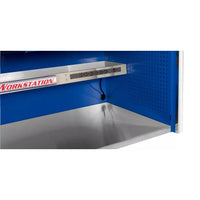 The built-in power strip has six outlets and an on/off switch, to charge all your power tools, batteries and electronic devices. You’ll be able to lock this 72 Inch Professional Hutch and walk away, leaving your tools and devices secure. In addition, you can key the lock to match the rest of your workstation or key it separately for more security. The full-width shelf and work surface are both made from brushed stainless steel (304 grade). Because the shelf is fully adjustable, you’ll be able to select the best height for your unique storage and working needs. Powder coated steel pegboard sides provide additional space for hanging tools.