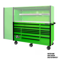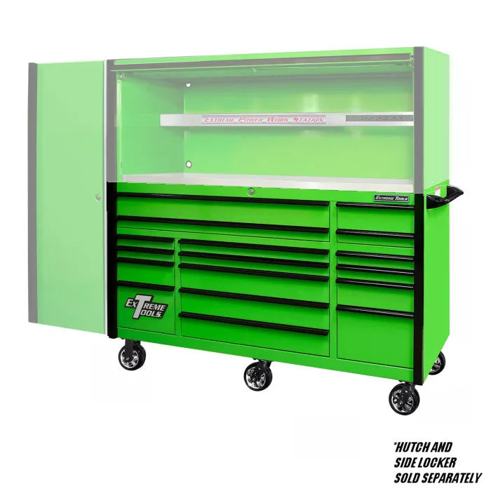 The EX7217RCQ Professional 72 Inch Triple Bank Roller Cabinet is not just about function. It is also about style. This flagship model design will catch your eye with it’s sleek look. Our patented design ensures that you will not see unsightly spot welds on the drawer fronts, hutch or side cabinet. Extreme Tools includes a professional 304 grade stainless steel work surface that will not yellow like cheaper versions. To accent all these professional features, the EX7217RCQ series offers you a variety of color choices in the cabinet and drawer pull colors. So, you can make it your own to coordinate with your garage or to stand out from anyone else.