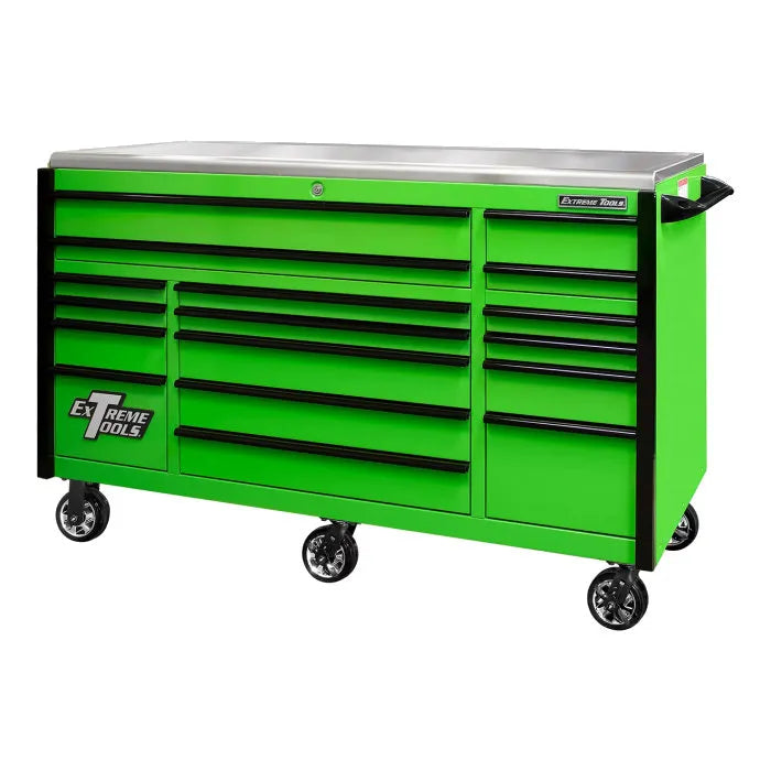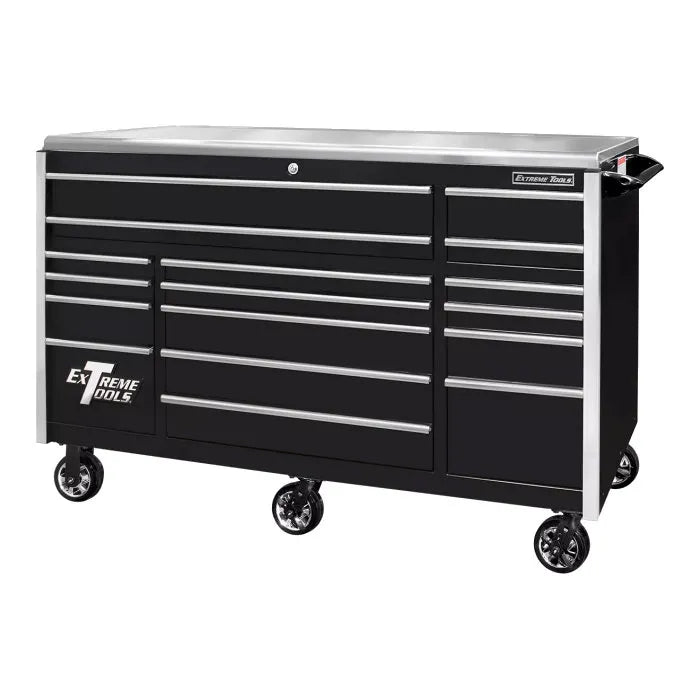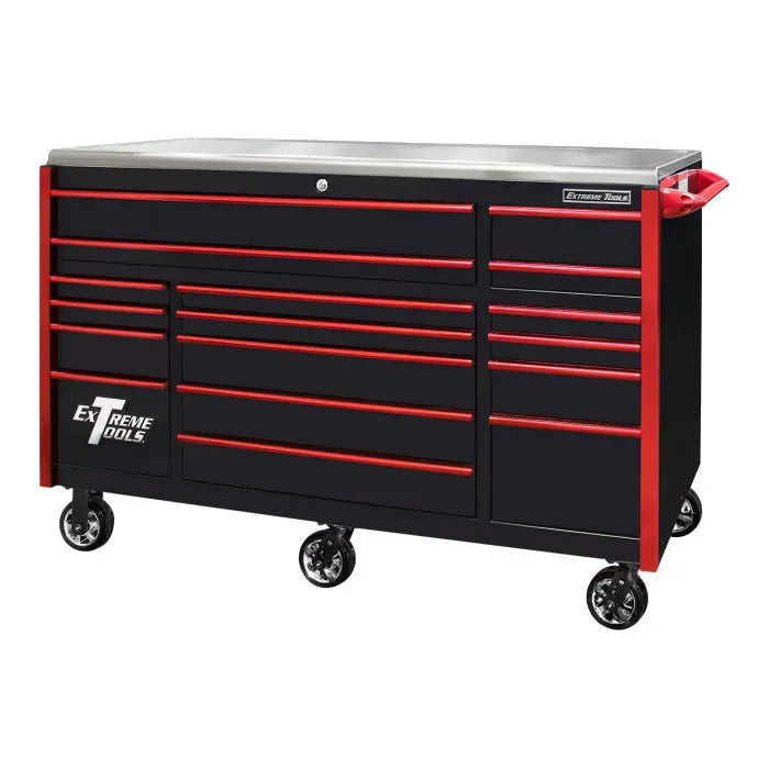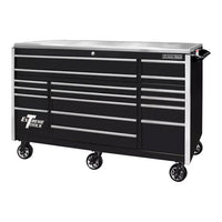 Extreme Tools EX Professional Series 72" 17-Drawer Rolling Cabinet is the ULTIMATE tool box in the EX Professional Series with our patented Quick Release drawer pulls. We have taken our flagship EX Professional Series with all its patented features and combined it with our state-of-the-art, upgraded Quick Release self-latching drawer pulls. Our goal? To create the most innovative, stylish, durable and Professional 72 Inch Triple Bank Roller Cabinet on the market.