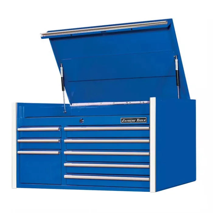 This Extreme Tools RX Professional Series 41 inch 8 Drawer Top Chest is the ultimate mid-size storage solution for all your tools, parts, and supplies. It features eight full-extension drawers that open and close easily on heavy-duty ball bearing slides. Plus, two sturdy gas lifts open and hold up the lid, giving you a ton of easy-to-access storage space in the top compartment.