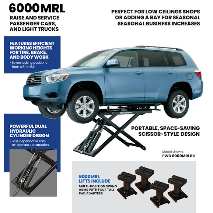 This mid-rise lift is an excellent choice for low ceilings or adding a bay for seasonal increases in business. The 6000MRL provides good working height for tires, brakes and body repairs. Efficient working heights for tire, brake, and body work.Additional Features:
