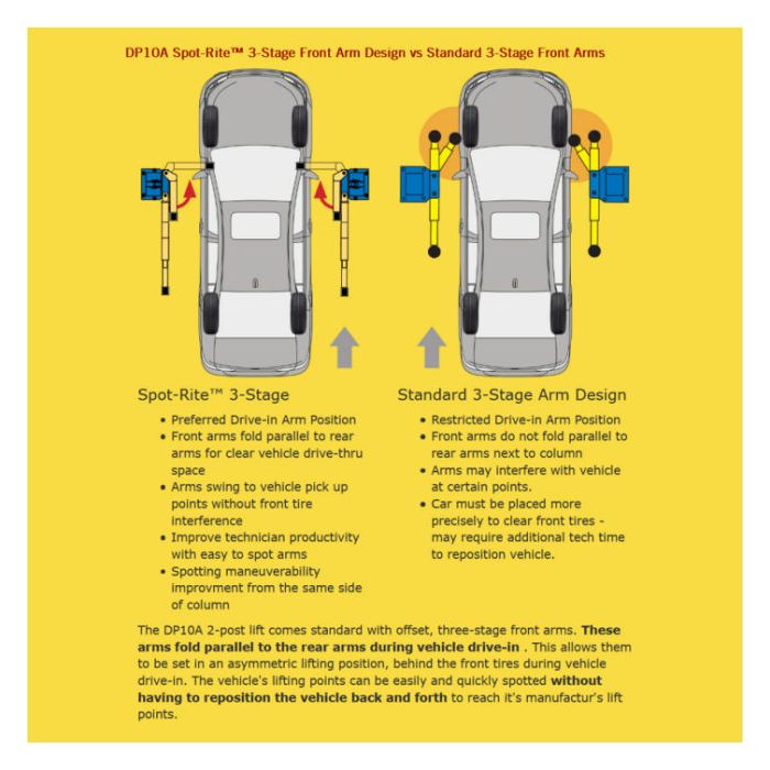 The DP10A is a two post surface mounted lift, featuring arm designs allowing vehicles to be raised symmetrically or asymmetrically. Forward Lift provides safe and reliable lift systems for independent repair shops, car dealerships, body shops, home enthusiasts, hobbyists and heavy-duty truck facilities. Incorporating a low-profile design, the DP10A 10,000 lbs. capacity two-post lift features low-profile/oversized pads with multiple extensions to raise most vehicles on the road today. Includes four (each) adapter extensions: 3.5" and 5". Integrating Spot-Rite™ 3-Stage Front Arm design, the DP10A features offset arms to accommodate vehicles both symmetrically and asymmetrically. This feature allows the technician to position the vehicle doors in front of or behind the column to prevent door damage.