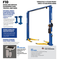 The F10 Two Post surface mounted lift, with three stage front arms and two stage rear arms, an affordable 10,000 pound lift that's engineered to perform. Frame engaging rubber padded truck adapters with multiple adapter extensions to raise most vehicles on the road today. Includes four of each of the following extensions: 3.5" and 5". The F10 Two Post Lift is ALI and ETL Certified.