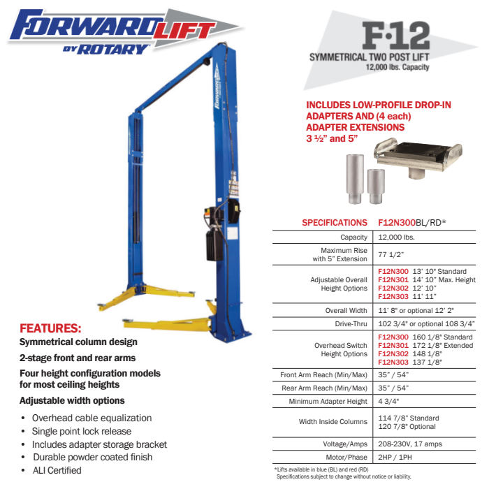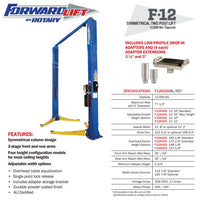 Forward's F12 two post lift is gold certified with a 12,000 pound capacity for raising most passenger cars, trucks and vans. With two heavy-duty push hydraulic cylinders designed to increase lift performance and minimize down-time. Cylinders are located in each column concealed within the carriage itself. Durable powder coat finish provides exceptional protection from the wears a shop will see over the years. Forwards spring operated arm restraints are just one feature that keep these heavy duty lift arms constantly performing at their peak. The F12 Two Post Lift is ALI and ETL Certified. The F12 is a commercial grade car lift and should not be confused with any other cheap two post vehicle lifts. This is a Forward lift so it has been engineered to perform and built to last!