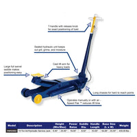 The Hein-Werner HW93667 4-Ton Air Assist Long Chassis Service Jack is a professional hydraulic service jack engineered to improve productivity in truck, bus, construction and farm equipment repair shops. Dual piston action provides speed to contact and power to lift. Extra-long chassis reaches under low overhangs. Features include T-handle with release knob and three locking positions, cast iron lift arm, and a sealed hydraulic unit that keeps out grit, grime, and moisture. Operates manually or with air assist. This premium quality floor jack is Made In USA.The Hein-Werner long chassis service jacks are serious tools for lifting serious heavy duty equipment. They are a favorite with for military and government contracts and can be found hard at work in heavy duty service departments across the country.