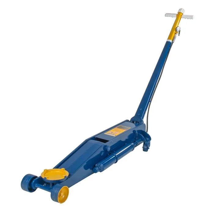 The Hein-Werner HW93667 4-Ton Air Assist Long Chassis Service Jack is a professional hydraulic service jack engineered to improve productivity in truck, bus, construction and farm equipment repair shops. Dual piston action provides speed to contact and power to lift. Extra-long chassis reaches under low overhangs. Features include T-handle with release knob and three locking positions, cast iron lift arm, and a sealed hydraulic unit that keeps out grit, grime, and moisture. Operates manually or with air assist. This premium quality floor jack is Made In USA.Â
