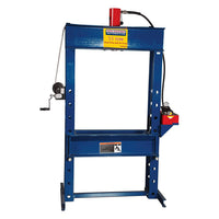 The Hein-Werner HW93403 is a 55 Ton Pneumatic Hydraulic Shop Press with a 13" Stroke and a 231 Cu. In. oil capacity Treadle Pump for easy foot operation. Hein-Werner shop presses are excellent for bending, bonding or straightening applications, ideal for the removal or installation of gears, universal joints, pulleys, wrist pins and other press jobs, and feature industrial grade rams and pumps, multi-position beds, and heavy steel welded construction.
