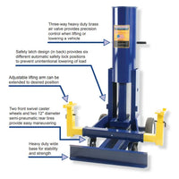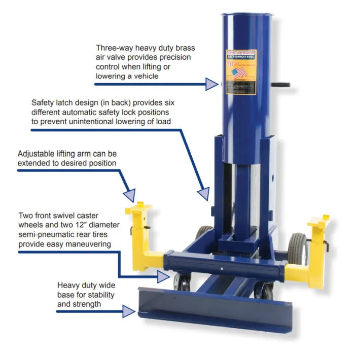 The Hein-Werner HW93690 10-Ton Air Operated End Lift has a long reach to get deep under truck and vehicle frames and it lifts up to 10 tons at 200 PSI. The Hein-Werner air operated end lifts allow a technician to effortlessly lift one end of a vehicle and they are Made in the USA for the ultimate in safety and functionality. Hein Werner's made in America quality really shines through on this one. It features a premium 3 way heavy duty brass air valve that allows for precise control when raising and lowering the automobile or truck. This bumper jack features 6 different locking positions that automatically engage to assure you safety when working underneath the lift. Unintentional lowering is not possible. The front has independent swivel casters for maneuvering, while the rear has 8" wheels for easy rolling. The lifting arm is adjustable so it can be positioned in any height you need.
