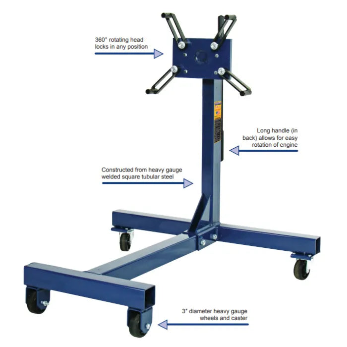 The Hein-Werner HW93778 Engine Stand is a commercial quality engine stand featuring a 360° rotating head that locks in any position. The HW83778 supports 1,250 lbs. engines and is constructed from heavy gauge welded square tubular steel. Features includes a long handle to easily rotate the engine, and 3" diameter heavy-duty wheels and casters.