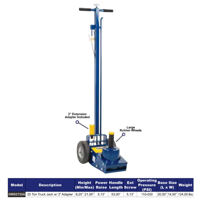 The Hein-Werner HW93735A 25-Ton Air Truck Axle Jack with 3" Extension is a compact and powerful professional air hydraulic truck jack with a specially a coated ram to prevent rust and extend the life of the jack. Features include low minimum height, rapid two-speed air hydraulic lifting action, air-power ram retraction, large 8" rubber wheels, pressure safety relief valve, and comes with 3" extension. This premium quality air hydraulic truck jack is Made In USA.When you're looking for quality, look to Hein-Werner. The quality is top notch and the US engineering is why nobody can beat them. This truck air jack model includes sizable rubber wheels on a sturdy steel hub for optimum mobility and a reliable safety valve that prevents overloading. Speedy air cylinder gets you up in a jiffy. Need a little more lifting height? No problem. Just utilize the handy extension screw to provide infinite adjustment to an additional 3 inches.
