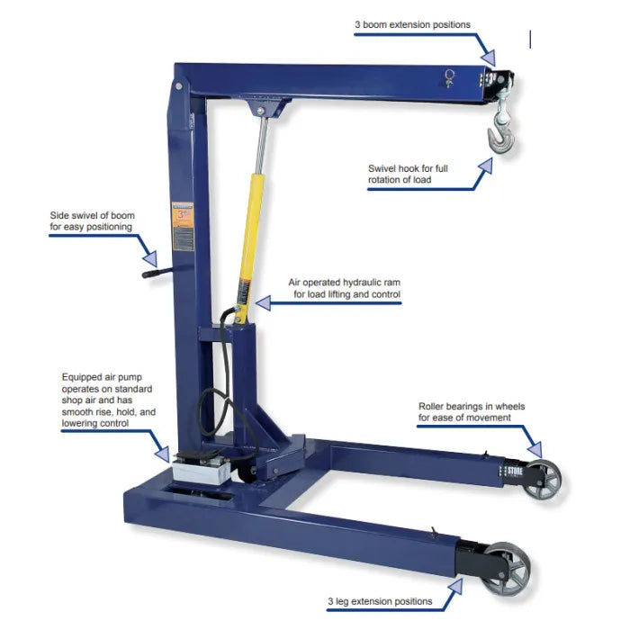 Hein-Werner HW93806 3-Ton Heavy-Duty Truck Engine Crane The Hein-Werner HW93806 3-Ton Heavy-Duty Truck Engine Crane is equipped with an air pump that operates on standard shop air and has smooth rise, hold, and lowering control. The HW93806 features 3 boom extension positions, 3 leg extension positions, swivel hook for full rotation of load, and roller bearings in wheels for ease of movement.Hein Werner has pulled out all the stops on this one. There are plenty of 2 ton engine hoist options out there, but few options when it comes to 3 ton models for heavy truck engines. And even fewer options when it comes to a premium quality, Made in America hoist. That's where the model HW93806 comes in. This one has got it all. Only the finest components go into the fabrication of this model. It features industrial grade steel construction, premium cylinder with chrome plated ram, easy rolling swivel casters to glide across your automotive shop floor, and it's equipped with an air pump that features a smooth and steady rise and precise lowering, so your technician has complete control at all times.