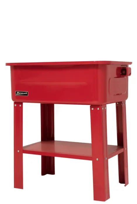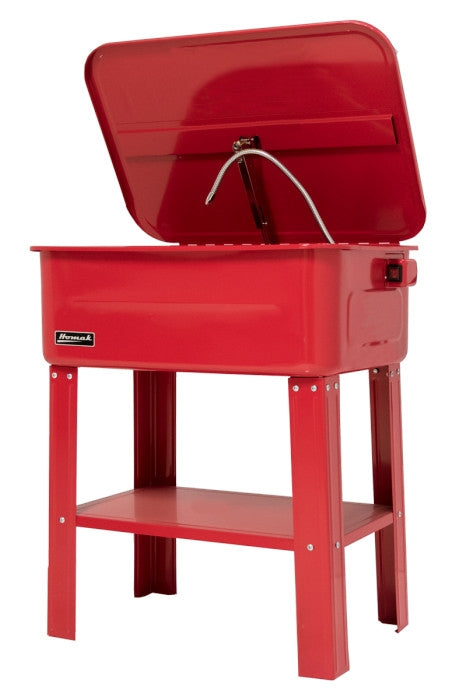 Large one piece tank for cleaning big parts and a washing basket for cleaning smaller parts, this solid steel designed parts washer, wtih flexible hose, will not leak.