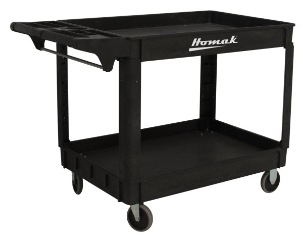 The Homak poly propylene service cart won't chip, rust or dent! Sturdy and durable, this service cart is built to last. Swivel casters for easy mobility, with locking levers to keep cart in place. Bottom shelf for extra storage, keep your tools organized and handy.
