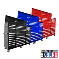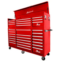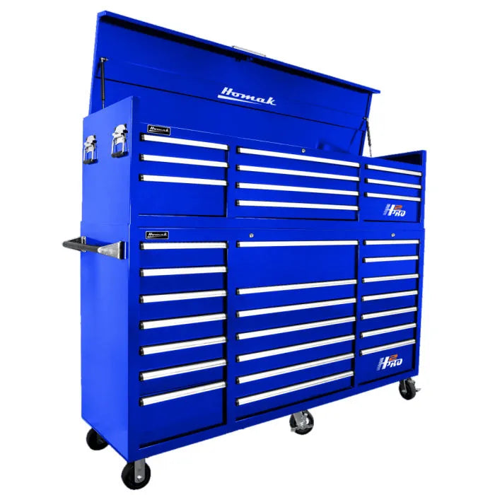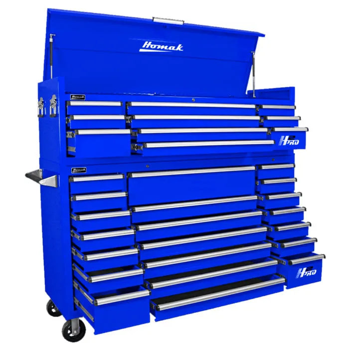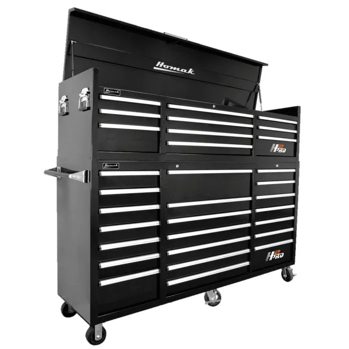 Homak's H2PRO 72" Top Chest and Rolling Cabinet Combo features 16 gauge steel construction, full extension gas struts, HMC high security tubular locking system, UV protected 3.2 mil powder coat finish, heavy-duty steel lift and push handles, power cord access hole, and 2 fixed and 2 locking heavy-duty swivel casters on the rolling cabinet. The 72" version has 2 fixed and 4 locking. Drawers feature full length aluminum pulls, contoured scoop and detent latch style, and replaceable 100 lbs. capacity ball-bearing slides. EVA foam drawer and top mat liners are included. Professional grade, this tool cabinet will last you a lifetime.