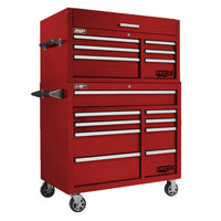 Homak's PRO II 41" Top Chest and Rolling Cabinet Combo features 19 gauge steel construction, full extension gas struts, HMC high security tubular locking system, UV protected 3.2 mil powder coat finish, heavy-duty steel lift and push handles, and 2 fixed and 2 locking heavy-duty swivel casters on the rolling cabinet. Drawers feature full length aluminum pulls, contoured scoop and lift latch style, and replaceable 100 lbs. capacity ball-bearing slides. EVA foam drawer and top mat liners are included. Professional grade, this tool cabinet will last you a lifetime.