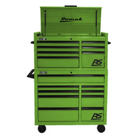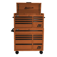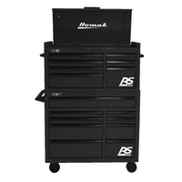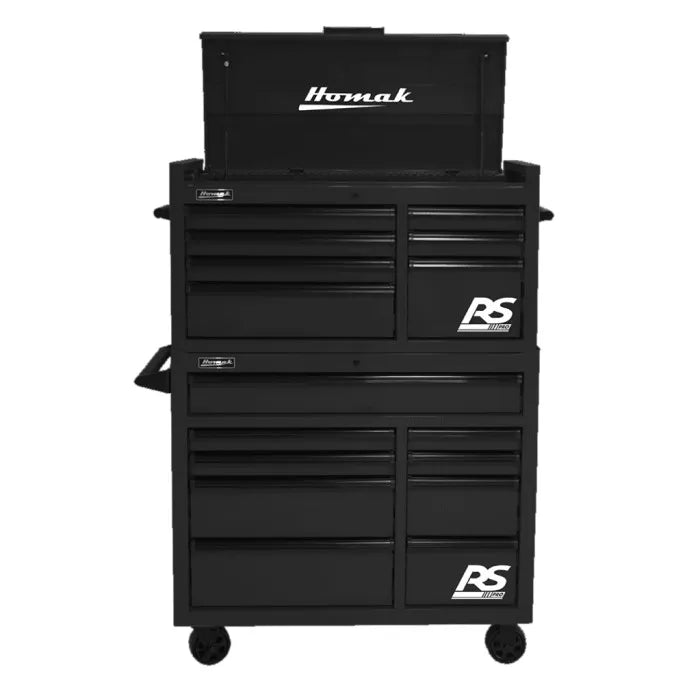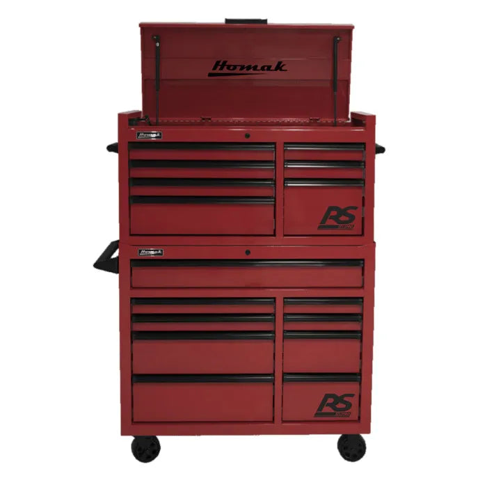 Homak's RS PRO 41" Top Chest and Rolling Cabinet Combo features 18 gauge steel construction, full extension gas struts, HMC high security tubular locking system, UV protected 3.2 mil powder coat finish, heavy-duty steel lift and push handles, 3 power outlets in the top chest, and 2 fixed and 2 locking heavy-duty swivel casters on the rolling cabinet. Drawers feature full length aluminum pulls, contoured scoop and lift latch style, and replaceable 100 lbs. capacity ball-bearing slides. PVC foam drawer and top mat liners are included. Professional grade, this tool cabinet will last you a lifetime.
