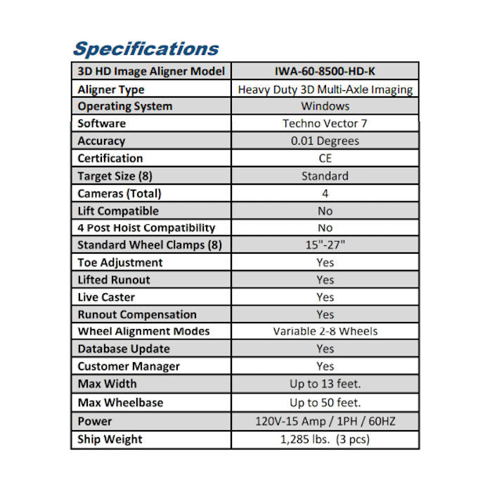 The iDEAL IWA-60-1500-K 'Multi-Axle' High Definition 3D Image Wheel Aligner System is one of the most economical & advanced heavy duty 3D multi-axle imaging alignment systems on the market today. The iDEAL 3D HD Imaging Wheel Aligner provides multi-axle wheel alignments for trucks, semi-trailers, and buses quickly & accurately without the need for vehicle lifting!